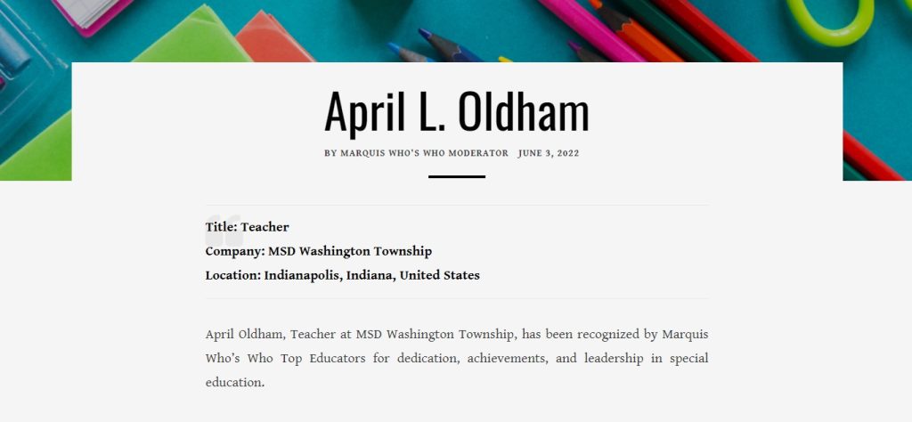 April L. Oldham, MEd, NBCT was inspired to spearhead a career in special education by her brother, who was born with multiple physical disabilities and only lived for four days. She pursued a formal education at Ball State University, where she earned a Bachelor of Science in special education and psychology, with a minor in educational psychology, in 1979. She later graduated from Butler University with a Master of Science in education, psychometrics and special education in 1982. Setting the tone for her career, Ms. Oldham remembers writing her parents a letter that said she needed to be the kind of teacher that she wanted her brother to have, someone who would treat him with respect and dignity.